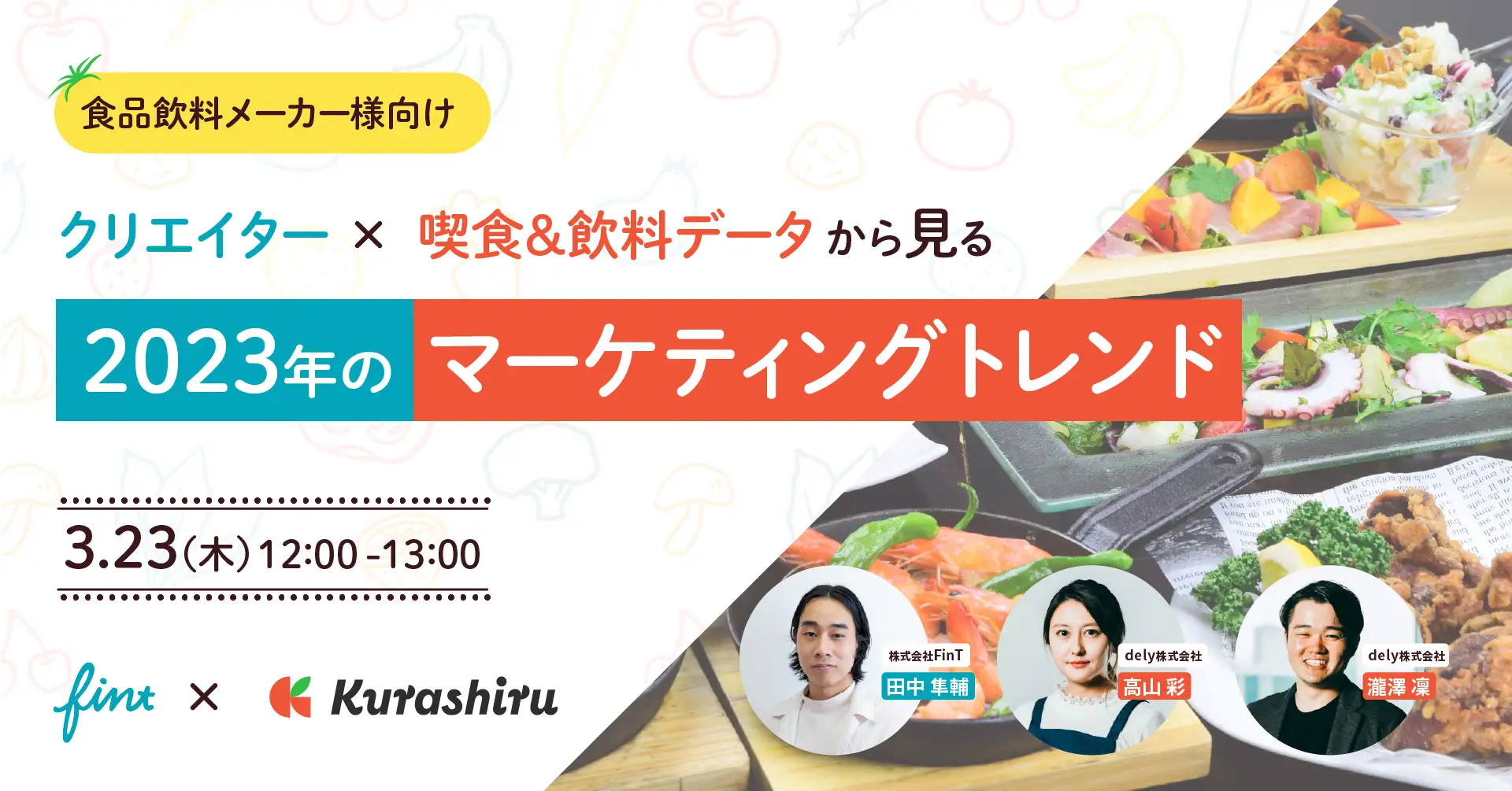 国内No.1レシピプラットフォーム「クラシル」を運営するdely株式会社とSNSを起点にマーケティング支援を行う株式会社FinTは、SNSパッケージを共同リリースし、共催セミナーを実施する運びとなりました。「クラシル」が持つ喫食&飲料データから得られる消費者インサイトと戦略設計、パーセプションを形成する上で欠かせないクリエイター活用から、2023年のマーケティングトレンドを解説いたします。
