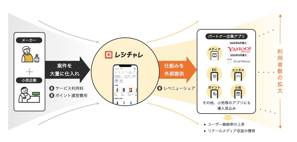 「レシチャレ」は、レシート買取りポイ活アプリにおいて掲載商品数No.1を誇ります。大手ナショナルクライアントを含む多様なメーカー・小売企業のキャンペーンを豊富に揃えているため、導入メディアは営業リソースをかけずに、即座に質の高い販促コンテンツを自社ユーザーに提供し、新たな収益源を確保できます。