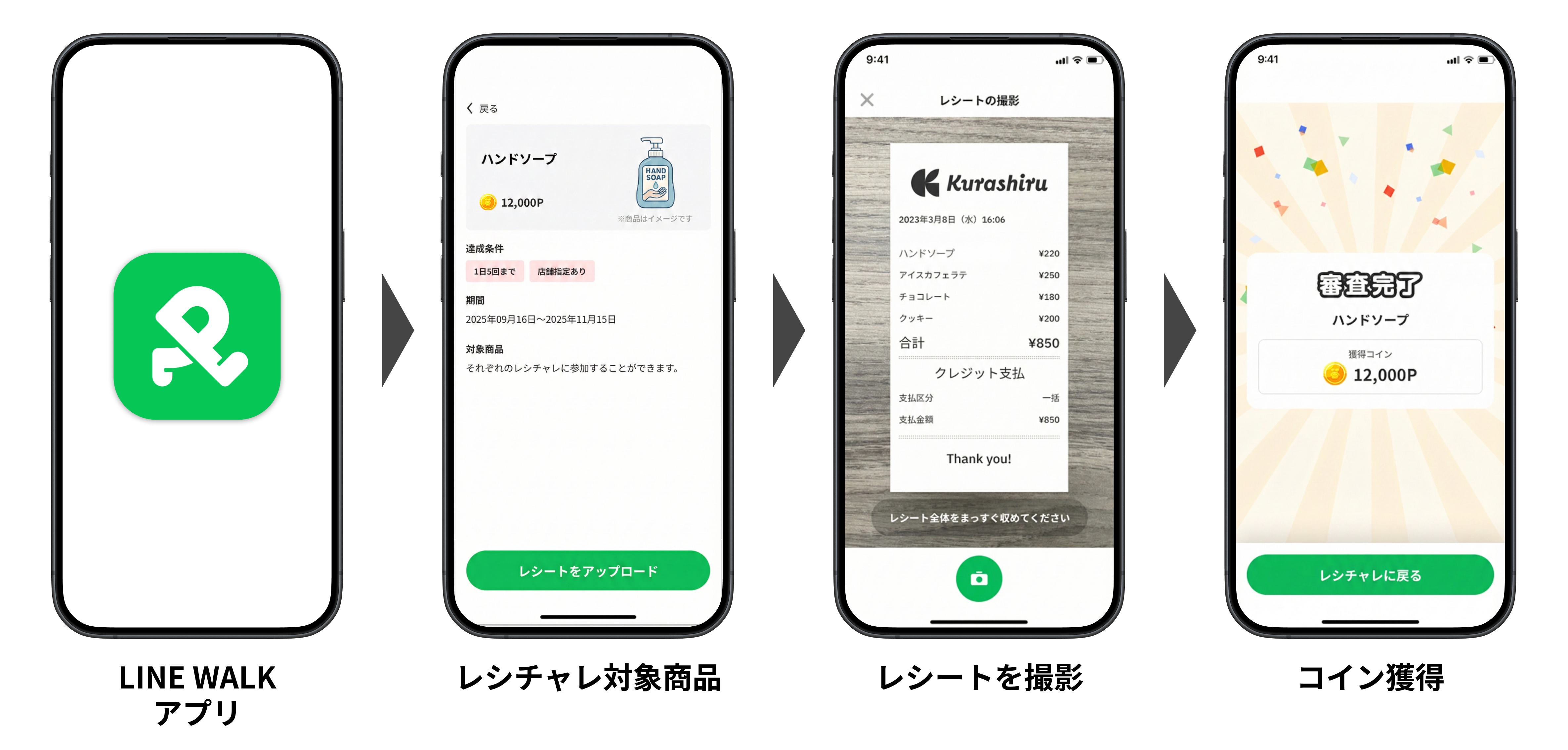 本連携により、「LINE WALK」内において、当社が提供するレシート買取り機能「レシチャレ」に掲載されている豊富な販促キャンペーンが展開されます。 ユーザーは、日常の「歩く」という活動に加え、スーパーやドラッグストアでの「買い物」という日常動作をポイントに変えることができ、よりお得で利便性の高いアプリ体験を享受できます。
