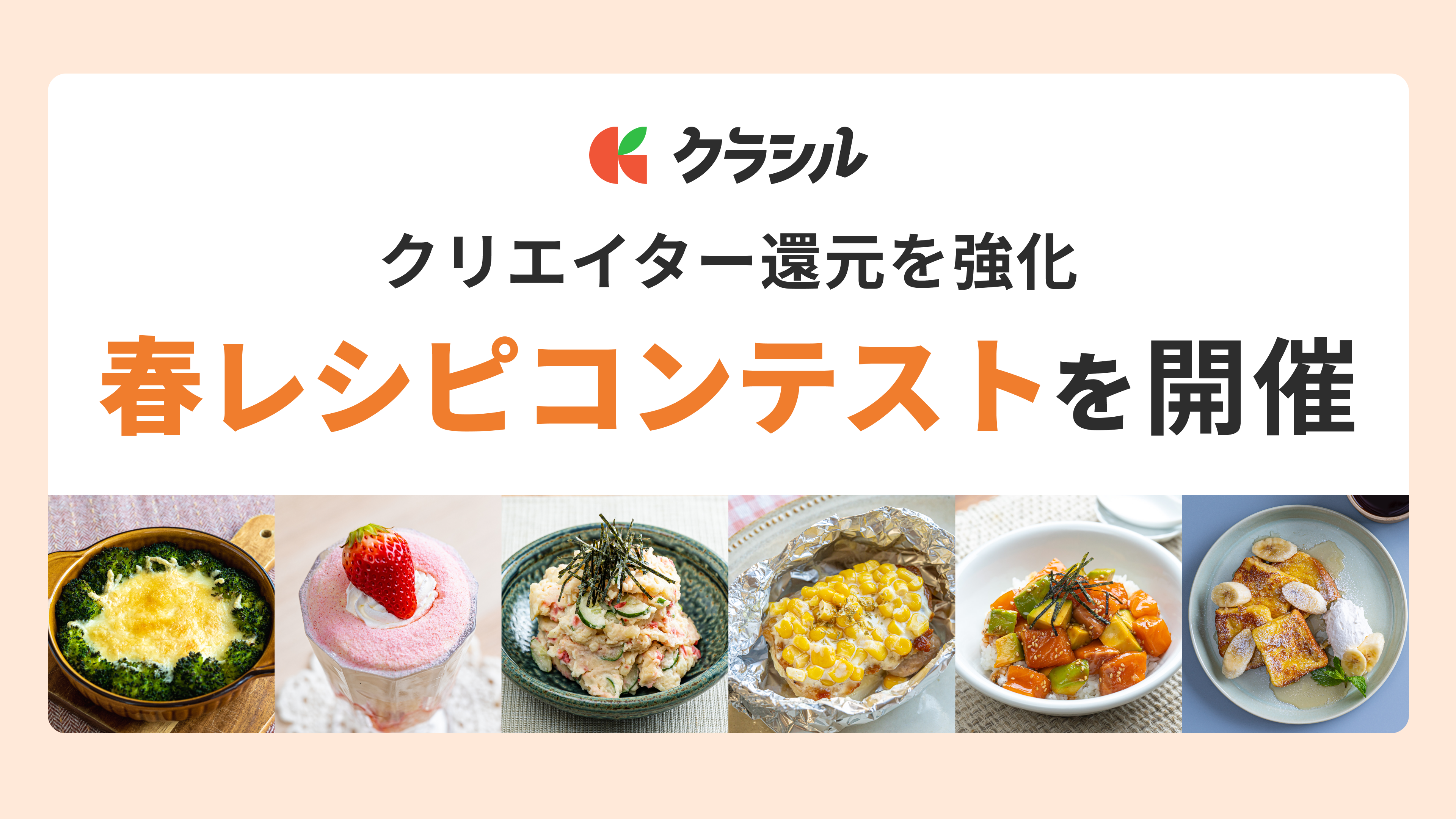 レシピ動画サービス「クラシル」は、同アプリ内においてレシピを投稿するクリエイターへの還元強化を目的に、レシピ投稿コンテスト「クラシル 春レシピコンテスト2026」を、2026年4月23日(木)10時より開始いたしました。