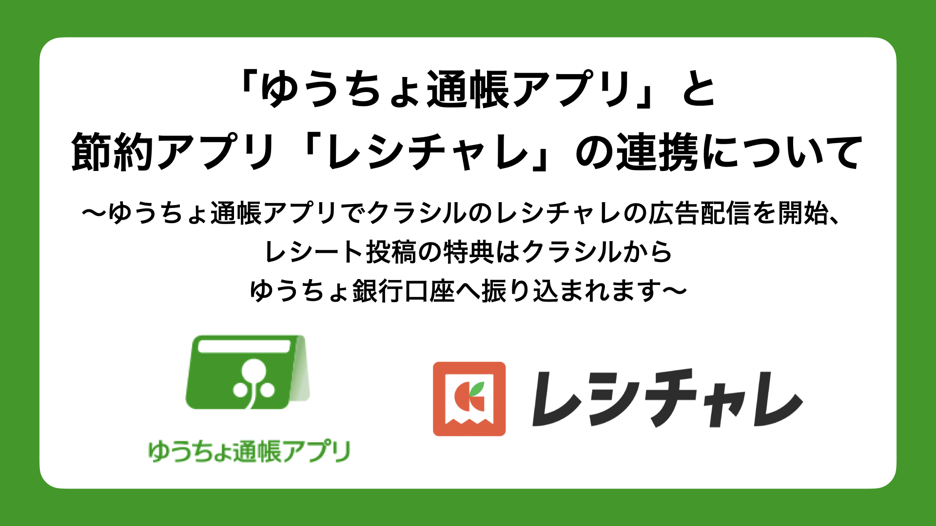 クラシル株式会社(本社:東京都港区、代表取締役社長:堀江 裕介、以下「クラシル」)と株式会社ゆうちょ銀行(本社:東京都千代田区、取締役兼代表執行役社長:笠間 貴之、以下「ゆうちょ銀行」)は、2026年9月(予定)より、クラシルが提供する節約アプリ「レシチャレ」と、ゆうちょ銀行が提供する「ゆうちょ通帳アプリ」との連携を開始いたします。