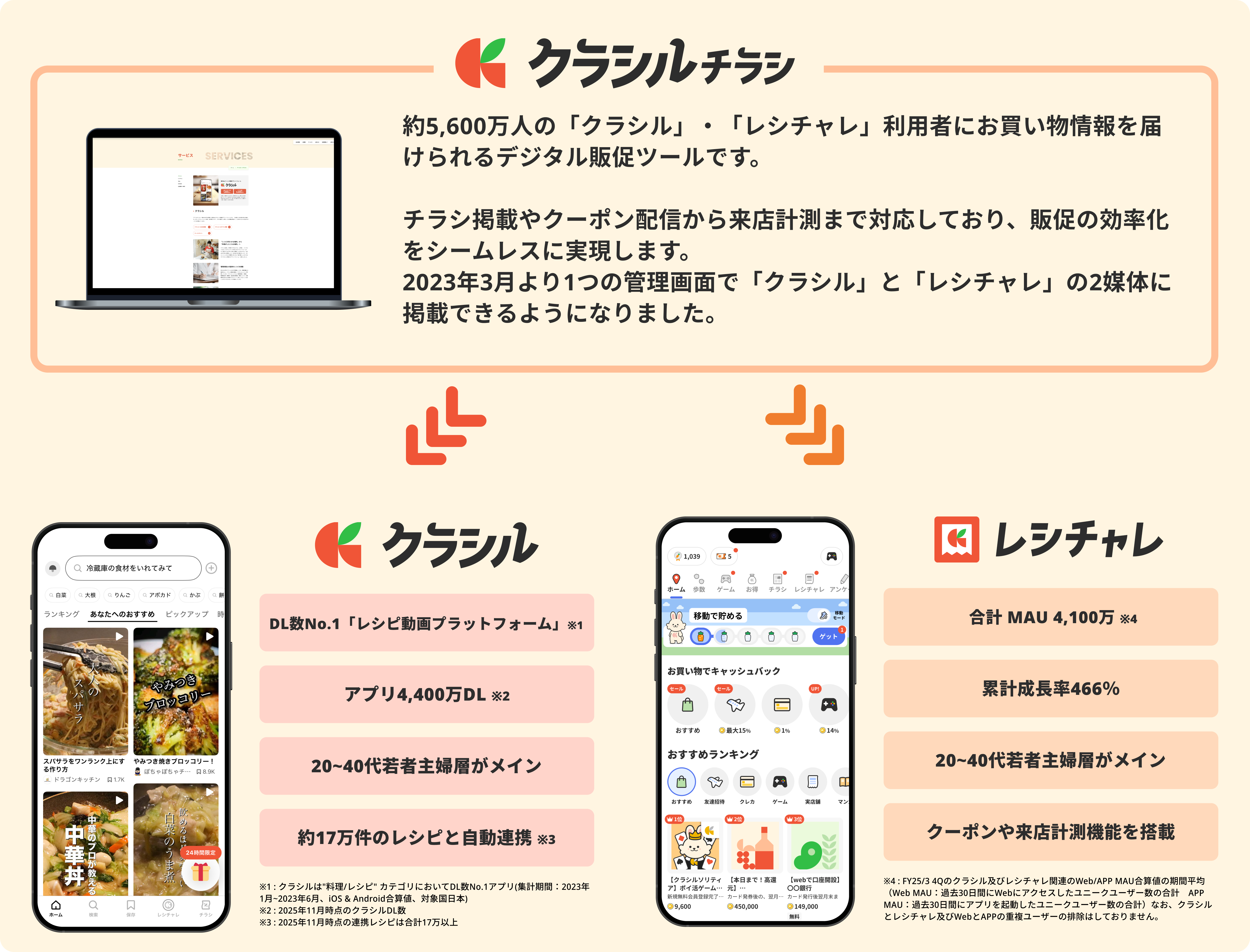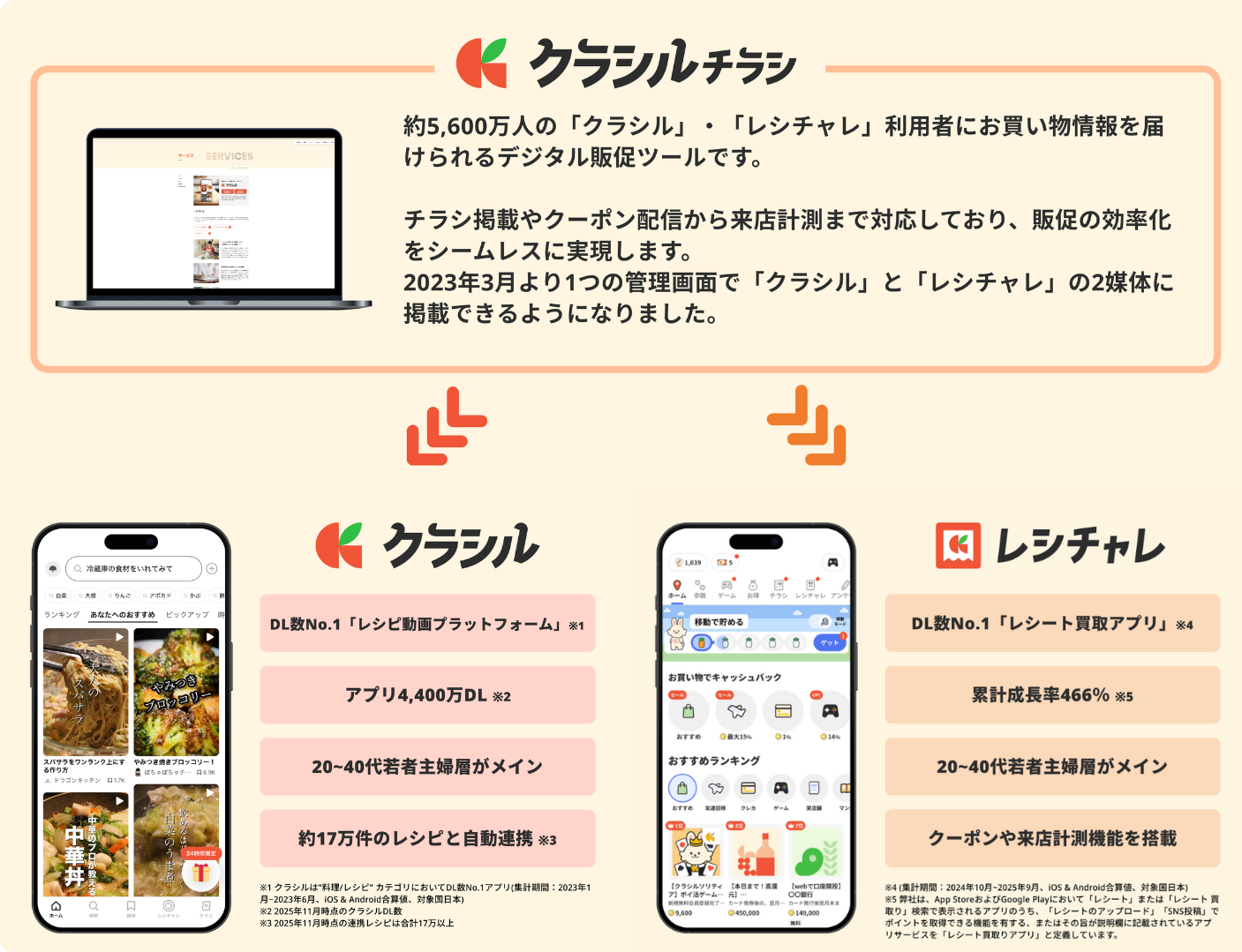 国内NO.1の月間利用者数・アプリダウンロード数を誇る食のプラットフォーム「クラシル」と買い物サポートアプリ「レシチャレ」2つの大規模なユーザーに対し一度の入稿作業でお買い得情報の配信が可能です。